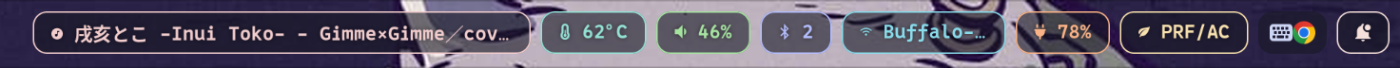 以下は私のstatus barです。status barとはWindowsのタスクバーやmacのmenu barに相当します。一般的にHyprlandなどのWMのみの提供となっているツールにbarは付属しない2ので、自分で用意することになります。